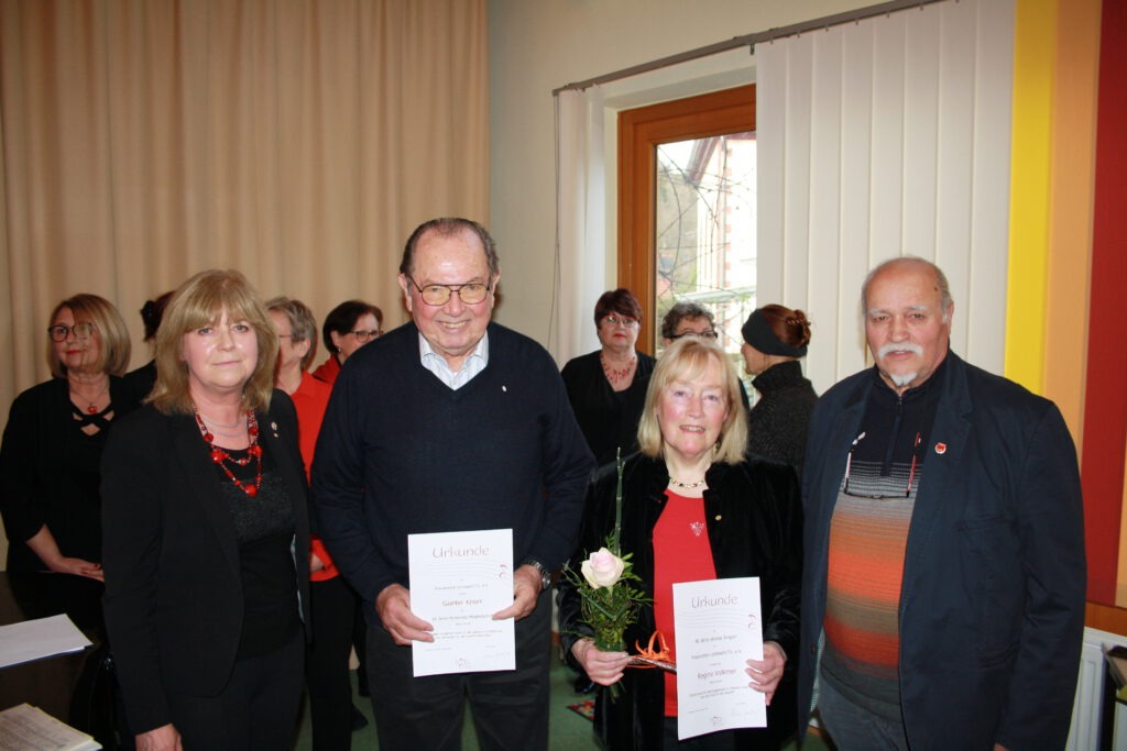 Bei den Ehrungen wurden Günter Knorr für 65jährige aktive bzw. passive Mitgliedschaft und Regine Volkmer für 40jährige aktive Mitgliedschaft durch Frau Junker und Herrn Schmidt geehrt. Sie erhielten Urkunden, Anstecknadel und ein Präsent. Beide Mitglieder berichteten, wie sie persönlich den Weg zum Chorgesang gefunden haben.