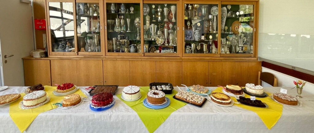 Natürlich war für das leibliche Wohl bestens gesorgt. Vom Grill gab es leckere Steaks und Wurstspezialitäten, die man sich zusammen mit Pommes gut schmecken ließ. Ein großer Getränkewagen hielt vielerlei kühle Erfrischungen bereit. Großer Beliebtheit erfreute sich auch das lange Kuchen- und Tortenbuffet im „Café Sängerlust“ im 1. Stock des Gemeindezentrums. Neben den Sängerinnen hatten auch ihre Freundinnen fleißig gebacken, so dass die Auswahl an süßen Köstlichkeiten sich sehen lassen konnte.